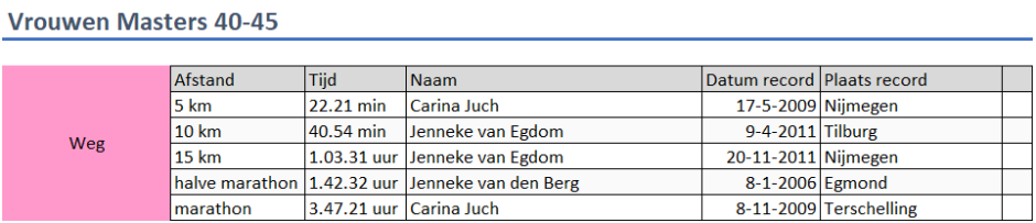 Clubrecords senioren: Vrouwen Masters 40-45