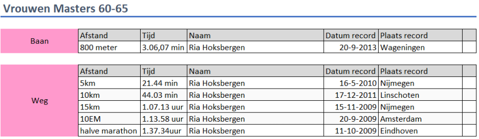 Clubrecords senioren: Vrouwen Masters 60-65